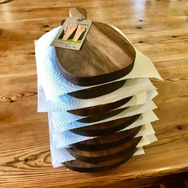 Mainly using found wood, I have made a range of serving platters, chopping boards, bread boards and similar items, a couple shown here. Alongside these are a carved serving spoon in cherry and a set of nested trivets made from recycled furniture. See also the Retail section on this page