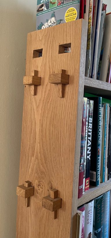 It’s impossible to have too much storage! The items shown are a bookcase in oak with the shelves fixed by wedges, shelves for a child’s room with vibrant uprights in purpleheart, a ‘by the back door’ box for storing shoes with a lid to sit on it to put them on, and a blanket chest in sycamore and brass. Other storage items have included garden caddies, bath shelves and bathroom shelves and cabinets