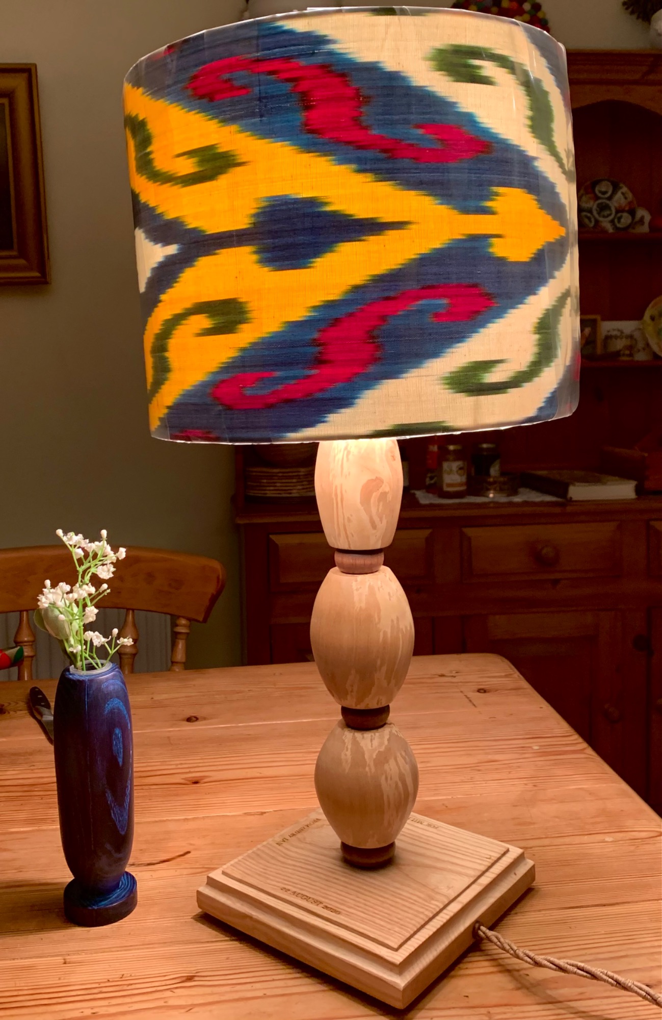 I have access to a wide range of woods via a local yard or, subject to carriage constraints, I can work with wood you supply me, for example if you want to recycle a favourite piece of family furniture rather than throw it out. The shaft of this lampstand, for example, was once a table leg!
