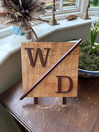 I can make signs that are either laid onto or cut into their base. The former allows a lot more freedom with design and fonts but is obviously more time consuming. I can also make things like trophy bases. The lettering on inlaid signs can be painted